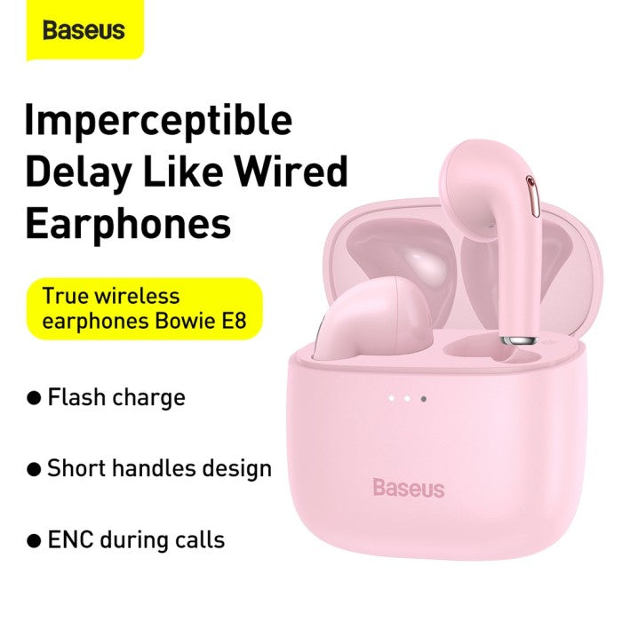 BASEUS True Wireless Earphones Bowie E8 NGE8 Brand: Baseus Name: Baseus True Wireless Earphones Bowie Model No.: Baseus Bowie E8 Material: ABS+PC Version: V5.0 Communication distance: 10m Music time: about 5 hours (70% of the volume) Music time with a charging case: about 24~30 hours Battery capacity: 40 mAh/0.148Wh(earphones) 350 mAh/1.295Wh(charging case) Earphone rated input: DC5V ? 72 mA Charging case rated input: DC5V ? 450 mA Earphone rated consumption current : 10 mA Charging case rated current consumption: 200 mA Charging time: about 1 hours Frequency response range: 20Hz-20kHz Charge interface: Type-C Suitable for: Compatible with all wireless devices Garansi 12 bulan **Kerusakan akibat pengguna gt; gt; Garansi void