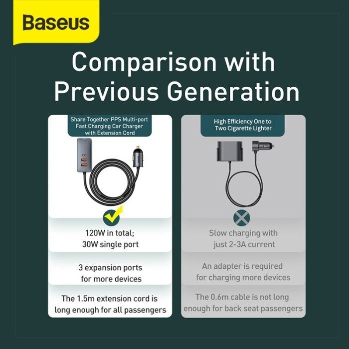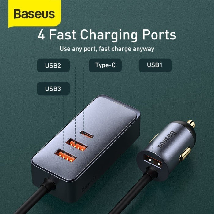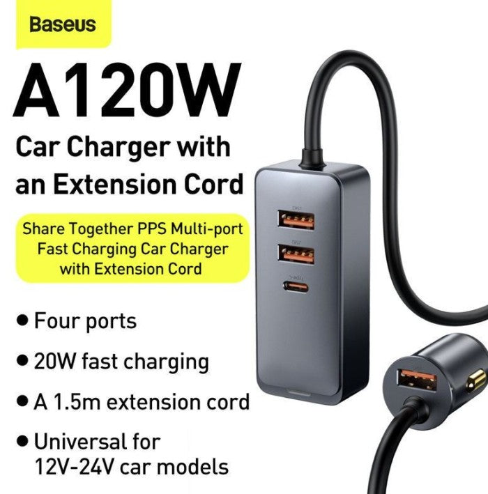 Baseus Share Together PPS multi-port Fast charging car charger with extension cord 120W 3U+1C Gray Material: Aluminium+PC Input: DC 12-24V USB1/ USB2/ USB3 Output: 5V/3A; 9V/2A; 10V/2A; 12V/2.5A 30W Type-C Output: 5V/3A; 9V/2.22A; 12V/2.5A; 15V/2A; 20V/1.5A 30W Total Output: 30W+30W+30W+30W Length: 1.5m Garansi: 12 Bulan (Cacat pabrik, langsung ganti baru; kerusakan akibat pengguna——?garansi void) Note: *Dimohon untuk menyertakan bukti video unboxing paket untuk menanggapi komplain karena kekurangan produk dsb. Tanpa bukti video kami tidak akan melayani.