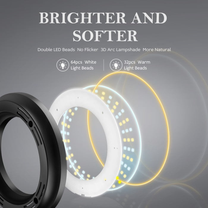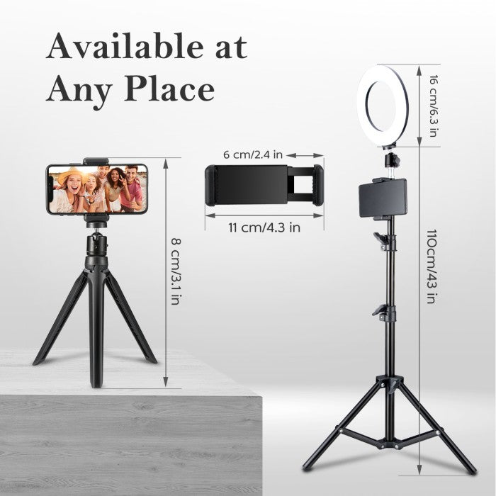 Atmoko 6.3 inch LED Ring Light for Shooting Lighting with Smartphone Charging Port, USB Charging, Remote Control, 5 Color Modes, 5 Level Dimming, Adjustable Tripod Stand, Smartphone Holder, Selfie Stick, Live Broadcasts, Nikon Students, Tiktok Instance, Selfie Photography Set Set Lampu LED Multifungsi, Lampu Cincin: Lampu cincin LED yang dapat diredupkan ini memiliki 5 pengaturan suhu warna (3.000 K - 6.500 K), dan 5 tingkat penyesuaian cahaya (hingga 1.200 lm). Anda dapat dengan bebas memilih mode warna dan kecerahan pilihan Anda. Kecerahannya dapat disesuaikan dari 0% hingga 100% untuk memberikan cahaya yang tepat untuk berbagai kesempatan, seperti mengambil gambar, membuat video, selfie, dan streaming langsung. Ukurannya yang kecil membuatnya mudah digunakan kapan saja, di mana saja Termasuk Port Pengisian Smartphone: Untuk memenuhi kebutuhan Anda, Atmoko telah merancang lampu cincin LED dengan port USB yang mendukung pengisian daya smartphone dan perangkat digital lainnya. Jika Anda menghubungkan ponsel cerdas Anda, Anda tidak perlu khawatir kehabisan baterai saat merekam video. Ini juga memiliki remote control sehingga Anda dapat mengontrolnya hanya dengan satu klik. Kabel USB yang nyaman juga disertakan, sehingga Anda dapat mengisi daya perangkat Anda kapan saja dengan desktop, bank daya, adaptor USB, atau pemantik rokok USB Dudukan Lampu Tripod yang Dapat Diperpanjang: Dudukan tripod yang dapat diperpanjang dapat disesuaikan dari 16,9 hingga 43,3 inci (43 hingga 110 cm), sehingga Anda dapat menggunakannya di meja Anda atau memanjangkannya ke tanah. Dudukan smartphone dapat dipasang ke dudukan dan disesuaikan dengan ketinggian yang diinginkan untuk digunakan (Rotasi 360° dan Pembuangan Panas Cepat) Dilengkapi dengan 2 sambungan universal, baik ring light maupun dudukan smartphone dapat diputar 360° untuk penyesuaian sudut yang optimal. Cangkang lampu cincin terbuat dari bahan tahan api PCB dan memiliki beberapa lubang pembuangan panas di bagian luar