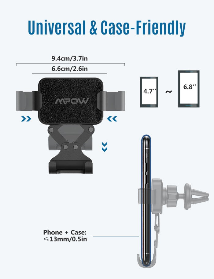 Mpow Mobil Dudukan Ponsel Ventilasi Udara Gravitasi Auto-Clamping Mobil Mount Stand Adjustable Sudut Pandang Universal untuk 4-6.5 Inci Ponsel Fitur: OPERASI SATU TANGAN YANG NYAMAN: Dengan desain gravitasi yang unik, dudukan mobil Mpow akan menjepit erat secara otomatis setelah Anda meletakkan ponsel di dudukan dan lepas otomatis saat Anda mengeluarkannya. Anda dapat mengoperasikannya hanya dengan satu tangan, dan tidak memerlukan stiker atau magnet tambahan di ponsel Anda. AMAN DAN STABIL: Desain bilah ganda berkontribusi pada pemasangan yang lebih mudah dan stabil, dan juga lebih tahan lama daripada bilah dengan pegas. Dukungan bawah dan lengan membentuk struktur segitiga stabil yang menahan ponsel Anda dengan aman bahkan di jalan bergelombang. KOMPATIBILITAS YANG LUAS: Dibandingkan dengan dudukan mobil gravitasi lainnya, dudukan mobil Mpow memiliki lengan yang lebih lebar dan kompatibilitas yang luas dengan ponsel dari 4.0 #39; #39; hingga 6.5 #39; #39; (TELEPON RAMAH KASUS), seperti Untuk iPhone Xs/Xs Max/XR/X/8/7/6 , untuk Samsung Galaxy S10/S10+/S8/S7/Note 9/8, untuk Google Nexus, untuk Huawei, untuk Xiaomi, dan lainnya. (ponsel 6,5 #39; #39; dengan casing ponsel tersedia) SUDUT LIHAT YANG DAPAT DISESUAIKAN: Anda dapat menyesuaikan dudukan mobil ke sudut pandang yang diinginkan dengan bebas melalui sambungan bola putar. Dukungan bawah memungkinkan kabel pengisian daya untuk melewati dan mengisi daya telepon.