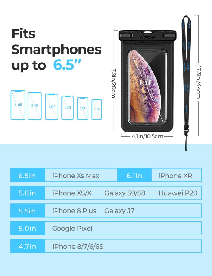 MPOW PA096A Waterproof Phone Pouch Mpow Upgraded Waterproof Case with Armband, IPX8 Universal Cell Phone Dry Bag Waterproof Pouch Bag for Iphone XS Max/XS/XR/X/8/8Plus/7, Galaxy, Note 9/8, HTC, Google Pixel, 2 Packs, Black+Black DESKRIPSI PRODUK Perlindungan penuh: Bersertifikat IPX8, Mow waterproof case menyediakan pencegahan air, salju dan debu untuk ponsel Anda, kartu kredit, dokumen, dan lain-lain. Bahan PVC + Tombol tahan air ABS terhubung dengan mulus untuk melindungi barang berharga Anda Lanyard dan ban lengan: Anda dapat menggantungnya di leher Anda atau membungkus leher Anda. Ban lengan yang dapat dilepas dan ditingkatkan Menampilkan desain 2 tingkat yang dapat disesuaikan, memanjang dari 7.5in (190mm) -15.9in (405mm) agar sesuai dengan ukuran lengan yang berbeda. Sempurna untuk berlari, jogging, ski, skating, berenang seluncur salju, memancing Tangkap foto bawah air yang tajam: Ambil foto bawah air yang belum pernah ada sebelumnya dengan Windows yang jernih. Perhatian: Tekanan di kedalaman dapat memengaruhi fungsi layar sentuh, harap gunakan tombol volume untuk mengambil foto di bawah air Sentuh-sensitif: Mudah untuk menyentuh layar pada perangkat Anda. Anda dapat berbicara, mengirim pesan teks, menggesek, melihat amp; mendengar ponsel Anda melalui kantong setiap saat. Catatan: ini berfungsi dengan semua tombol beranda tetapi tidak untuk sidik jari ID sentuh KASUS tahan air universal: Kompatibel dengan perangkat hingga 6,5 inci seperti Seri iPhone: iPhone XS Max/XS/XR/X/8/8 Plus, Galaxy S9/S8/ S7 Edge, Google Pixel/ Pixel Plus, HTC One M10, M9, LG G4 G3 G2 , Hua Wei P9, Sony Experian Z3, Z2, Z1, Nokia Lumia1020 Blackberry, dll.