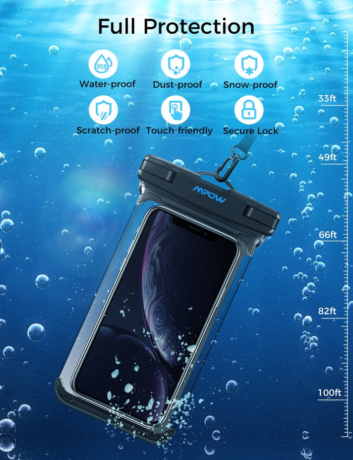 MPOW PA140A Waterproof Phone Pouch Mpow Waterproof Case, Full Transparency Waterproof Phone Pouch IPX8 Universal Cellphone Dry Bag Compatible for iPhone 11 Pro Max/Xs Max/XS/XR/X/8, Galaxy S20/S10, Google up to 6.8 Inches (Black+Black) DESKRIPSI PRODUK UNIVERSALITAS: Sempurna untuk ponsel dengan layar 6,5 inci atau kurang, seperti iPhone Xs Max/Xr/X/8/8 Plus/7/7 Plus, Galaxy Google, atau ponsel Android lainnya. Cocok juga untuk menyimpan uang, kartu, sertifikat, dan aksesoris lainnya. Nikmati saja saat-saat di pantai, jogging, kayak, snorkeling, mandi, berenang. TEPI HALUS UNTUK PENGOPERASIAN MUDAH: Kantong telepon tahan air satu bagian mengurangi jahitan dengan potensi risiko kebocoran, yang lebih aman daripada kantong kering biasa. Tepi halus mudah bagi Anda untuk MENGOPERASIKAN SIDE-KEY dan mengambil gambar. IPX8 WATERPROOF: Perlindungan kedap air untuk telepon. Hal ini dapat digunakan di bawah 30m/100ft air. Casing tahan air Mpow menahan air, debu, pasir, kotoran, salju, dan elemen lain yang dapat merusak ponsel. Catatan: Anda disarankan untuk mengambil foto dengan tombol volume di bawah air. LANYARD YANG DAPAT DISESUAIKAN DAN TAHAN LAMA: Panjang lanyard dapat disesuaikan antara 13.2-23.6in, memberikan pengalaman pemakaian yang lebih nyaman. CATATAN: 1. Ponsel dengan casing ponsel besar tidak disarankan di dalam kantong ponsel tahan air ini! 2. Ponsel mungkin mengalami tekanan hidrolik di bawah kedalaman air tertentu, yang akan memengaruhi pengoperasian layar sentuh. Silakan ambil foto dengan tombol volume dalam kasus ini. 3. Mudah mengoperasikan fungsi layar sentuh, tetapi TIDAK untuk sidik jari ID sentuh. 4. Tas tahan air di dalam kabut adalah fenomena normal.