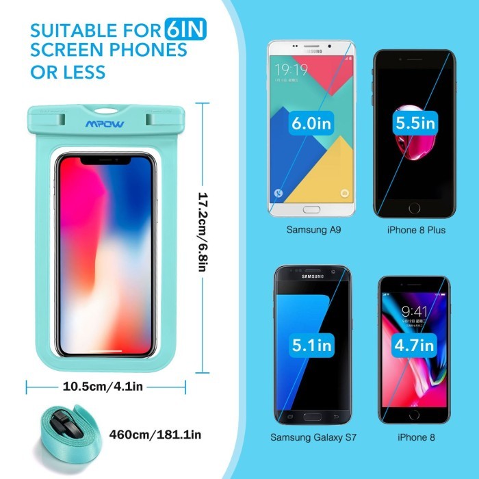 DESKRIPSI PRODUK CATATAN: 1. Ponsel dengan kotak berang-berang besar tidak disarankan di dalam tas ini! 2. Ponsel mungkin mengalami tekanan hidrolik di bawah kedalaman air tertentu, yang akan memengaruhi pengoperasian layar sentuh. Silakan ambil foto dengan tombol volume dalam kasus ini. 3. Mudah mengoperasikan fungsi layar sentuh, tetapi TIDAK untuk sidik jari ID sentuh. 4. Tas tahan air di dalam kabut adalah fenomena normal Bersertifikat IPX8: Sepenuhnya submersible dan tahan air, kasing tahan air dirancang untuk kondisi ekstrem Pengoperasian Gratis dan Penutup Transparan: Penutup ponsel tipis tahan air ini dirancang untuk tidak menghalangi penggunaan layar sentuh bahkan di bawah air. Penutup transparan di sekelilingnya agar tidak menghalangi penggunaan kamera. Anda dapat mengoperasikan ponsel Anda dengan sempurna tetapi BUKAN untuk sidik jari ID sentuh. Universalitas: Cocok untuk semua Smartphone besar di bawah 6,5 inci amp; uang tunai Anda, dokumen, kartu kredit, dll, sangat baik untuk kegiatan indoor amp; outdoor, olahraga air, perjalanan. Kompatibel dengan sebagian besar smartphone (di bawah 6,5 inci) termasuk iPhone 11 Pro Max, 11 Pro, Xs Max, Xs, Xr, X, 8, 8 plus, 7 plus, 7, Galaxy S10 S9 S8 S7 S6, S6 Edge plus, dll. Tas Telepon Tahan Air Multifungsi: Memiliki akses snap dan kunci sederhana, mudah untuk menahan air, salju, debu, pasir, dan kotoran.