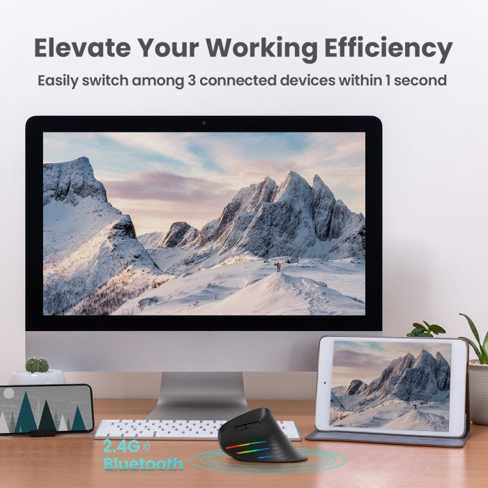 VictSing RGB Rechargeable Ergonomic Mouse, Easy-switch hingga 3 Perangkat, Vertikal Wireless Bluetooth Mouse, 5 DPI yang Dapat Disesuaikan Kenyamanan Ergonomis yang Dapat Diakses. Bentuk vertikal hemispherical dirancang agar pas dengan telapak tangan Anda secara alami tanpa memuntir. Jempol dan jari kelingking menawarkan dukungan yang cukup untuk tangan Anda. Mouse vertikal VictSing menjaga tangan Anda dalam posisi yang nyaman dan membantu mengurangi ketegangan pergelangan tangan dan kelelahan tangan. Tiga Konektivitas untuk Efisiensi Lebih Tinggi. Dengan mode nirkabel 2.4G dan mode Bluetooth ganda, mouse multi-mode VictSing dapat menghubungkan hingga 3 perangkat, seperti smartphone, tablet, dan PC. Sederhanakan operasi lintas perangkat Anda melalui tombol sakelar mode. Sempurna untuk pengembang, materi iklan, dan lain-lain. Lampu Latar RGB yang Immersive dan Dapat Disesuaikan. Tiga bilah lampu di sebelah kiri mouse nirkabel dengan 4 mode lampu yang dapat disesuaikan membuatnya berbeda dari yang lain. Pilih mode cahaya pilihan Anda agar sesuai dengan stasiun kerja Anda. Kenyamanan yang Kuat dan Dapat Diisi Ulang. Baterai lithium 500mAh built-in, mouse ergonomis VictSing tetap bertenaga hingga 2 bulan (mati lampu) atau hingga 15 hari (menyala) dengan pengisian penuh. Indikator baterai rendah akan mengingatkan Anda untuk mengisi ulang tepat waktu. Tidak perlu mengganti baterai lagi. Klik Tanpa Suara yang Menyenangkan. Dengan sakelar mikro bisu, mouse Bluetooth VictSing memberi Anda pengalaman mengklik yang tenang. Tetap fokus pada pekerjaan Anda tanpa khawatir mengganggu orang lain di sekitar Anda. Penuhi berbagai kebutuhan Anda dengan 5 DPI yang Dapat Disesuaikan (800/1200/1600/2000/2400). Spesifikasi: DPI: 800/1200/1600/2000/2400 Kapasitas Baterai: 500 mAh Mode Lampu Latar: 4 Mode Lampu Latar RGB yang Dapat Disesuaikan Lampu Indikator: berkedip cepat saat baterai lemah; tetap stabil saat mengisi daya; mati saat terisi penuh
